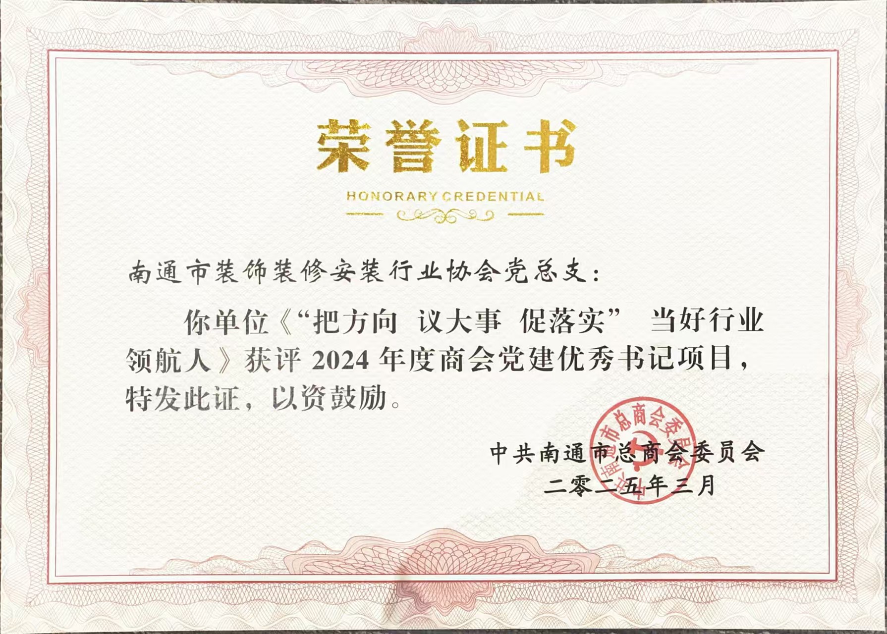 中共南通市裝飾裝修安裝行業協會黨總支被市總商會黨委表彰為先進基層黨組織;協會黨總支的“把方向 議大事 促落實 當好行業領航人”黨建書記項目被表彰為黨建優秀書記項目;南通市裝飾裝修安裝行業協會黨總支組織委員、第二支部書記、南通盛典瑞家裝飾設計有限公司總經理葛擁軍同志被表彰為優秀黨務工作者;江蘇帝豪裝飾股份有限公司總工程師袁玉蓮同志被表彰為優秀共產黨員。